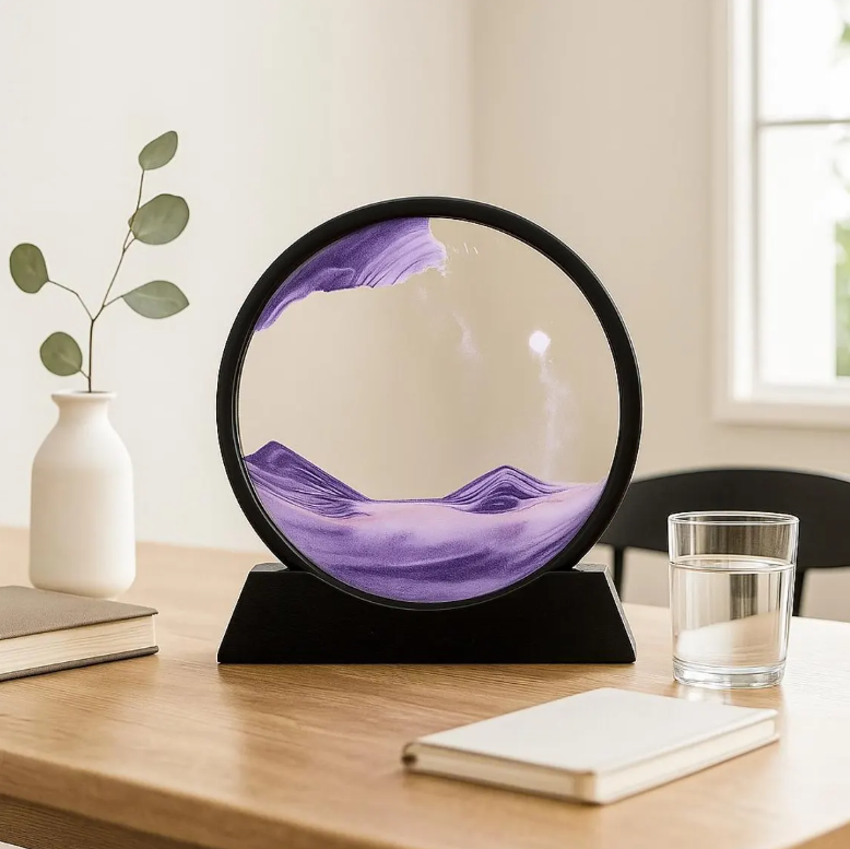 Le mouvement du sable, fluide et continu, diffuse une énergie relaxante qui adoucit l’ambiance et invite à un moment de pause.